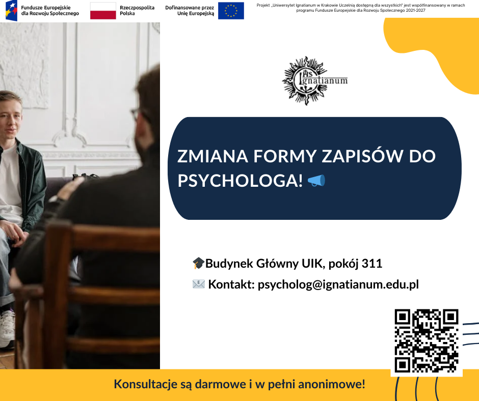 Uprzejmie informujemy, że od dnia 29 września 2025 r. zapisy na indywidualne konsultacje psychologiczne dla studentów będą prowadzone za pośrednictwem platformy USOS.